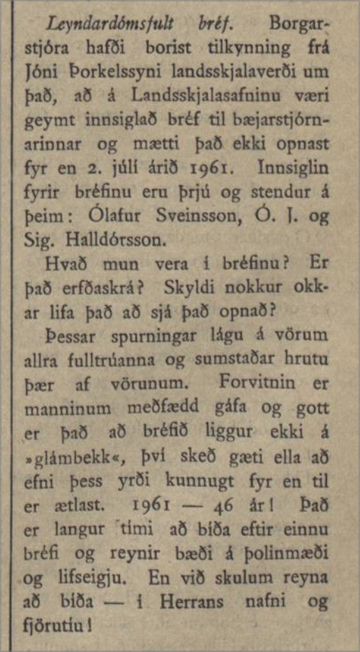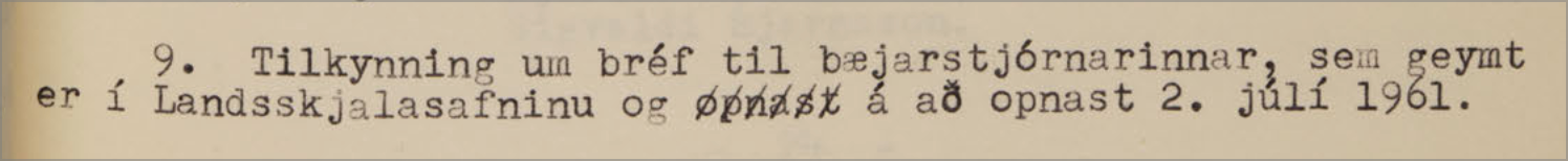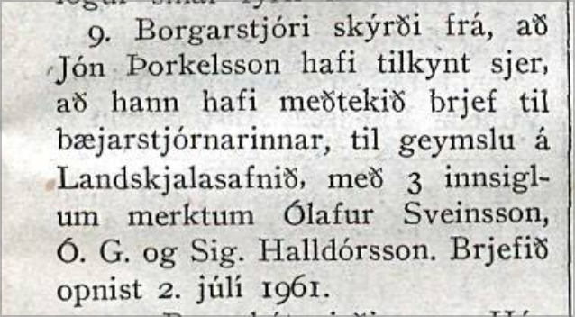Hér er bæjarstjórn Reykjavíkur tilkynnt um að í Landsskjalasafninu sé varðveitt bréf sem eigi að opna árið 1961, 47 árum síðar.