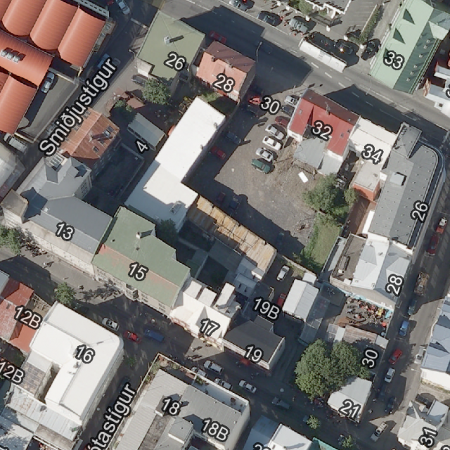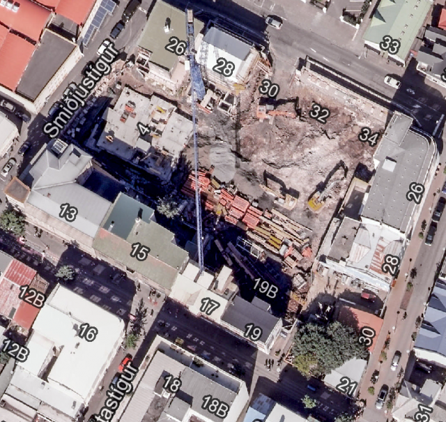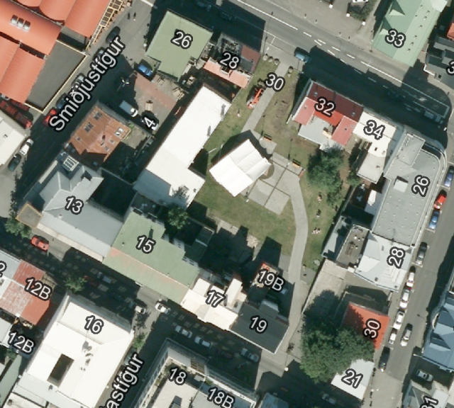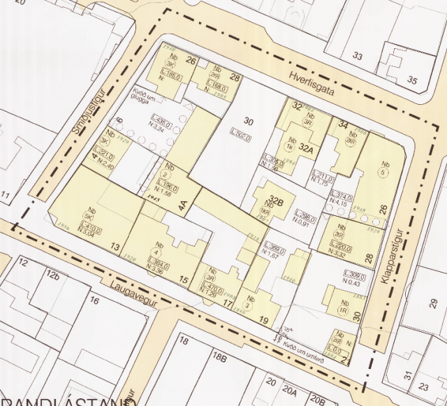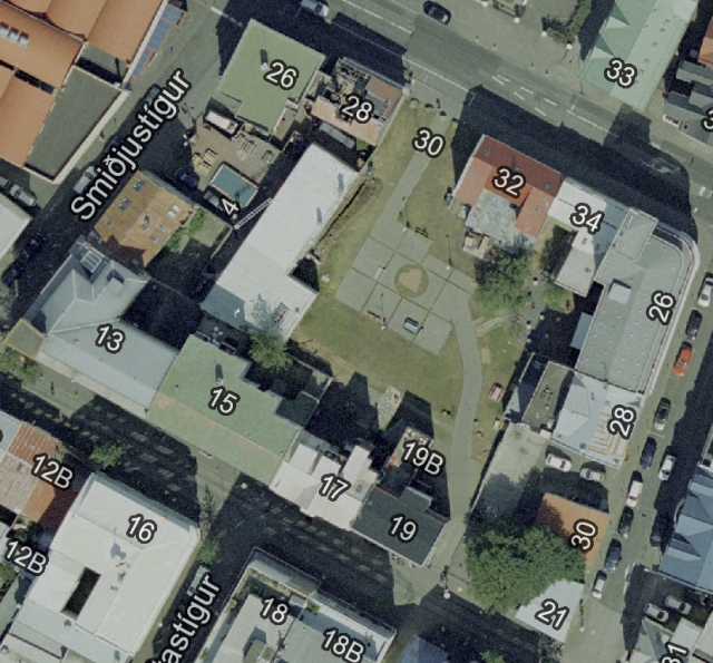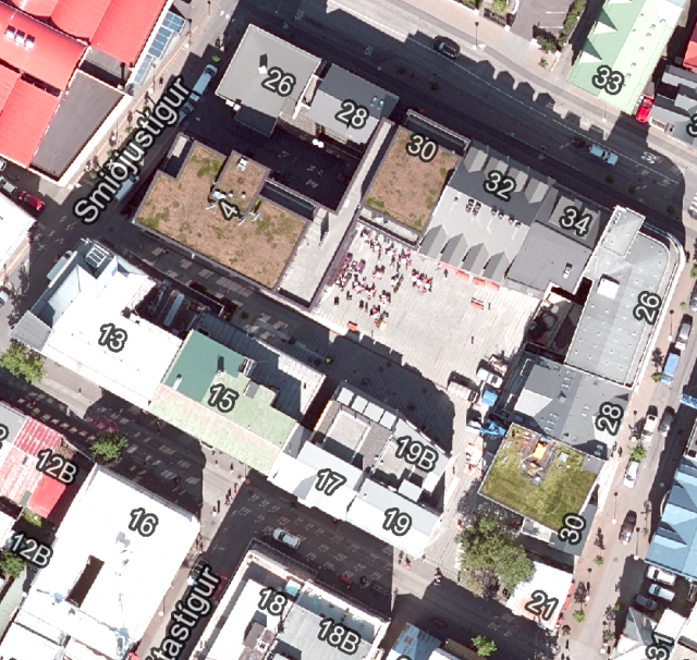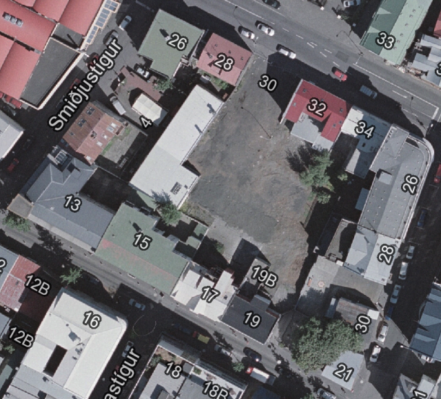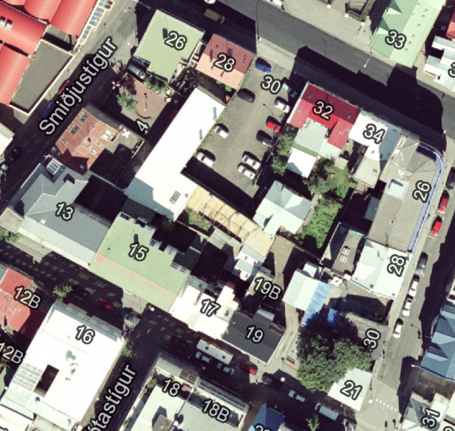 Þarna má sjá "skúraröðina" sem hýsti Grammið, bakvið Laugaveg 17. Grand Rokk er þarna á Smiðjustíg og innst inni á bílastæðinu sem er á lóð Hverfisgötu 30 er hús sem hafði heimilisfangið Hverfisgata 32b.Bakvið Hverfisgötu 32 var gamall steinbær, Hverfisgata 32a. (Athugaðu að húsnúmerin á myndinni miða við núverandi lóðamörk).