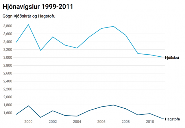 Þjóðskrá Íslands hóf í október síðastliðnum að birta mánaðarlegar tölur um stofnun hjúskapar og lögskilnaði.