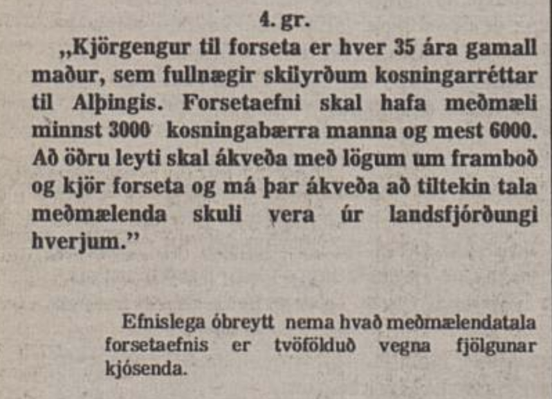 Að öðru leyti skal ákveða með lögum um framboð og kjör forseta, og má þar ákveða, að tiltekin tala meðmælenda skuli vera úr landsfjórðungi hverjum í hlutfalli við kjósendatölu þar.