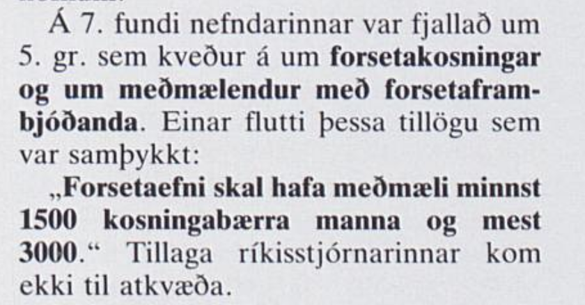 En hvaðan kemur þessi hugmynd yfir höfuð. Afhverju þarf að reisa girðingar til þess að kjörgengt fólk geti boðið sig fram til þessa embættis? Ég ætla ekki að fara djúpt í þær ástæður en hvet þig til að lesa góða úttekt Svavars Gestssonar heitins á því ferli sem leiddi af sér stjórnarskrá lýðveldisins sem birtist í Rétti 1993. Þar kemur m.a. fram að tillagan kom frá Einari Olgeirssyni (málið er flóknara, en látum þetta nægja).