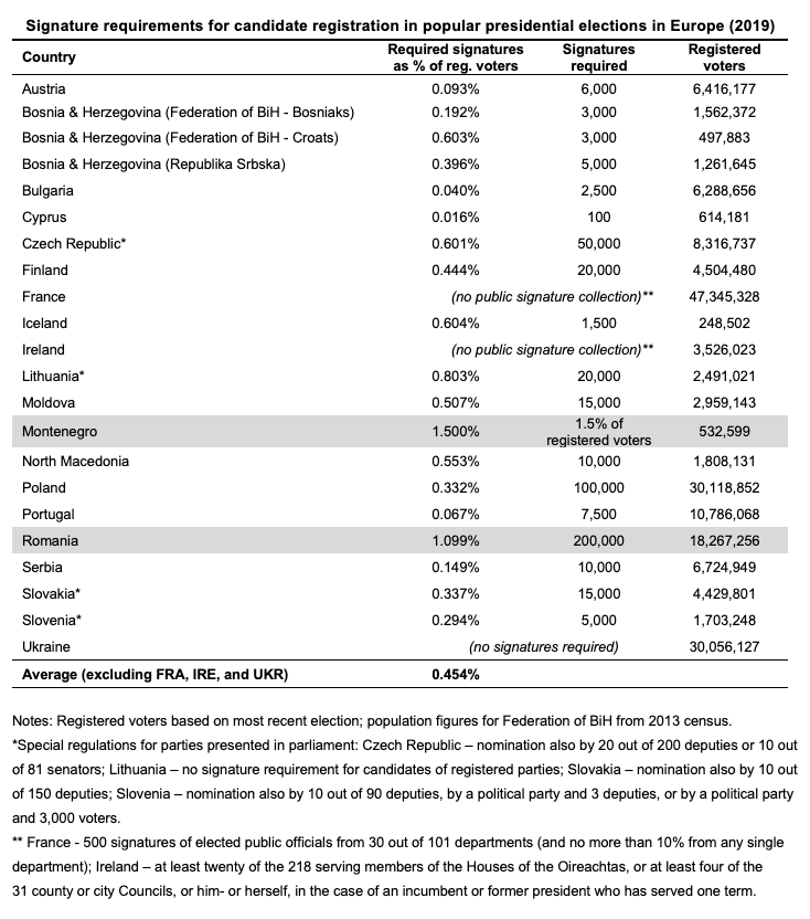 In any case, it is generally agreed that signature requirements should not be too high. The Code of Good Practice in Electoral Matters stipulates that a maximum of 1% signature requirement in relation to the electorate of the national or constituency level where elections are held should not be exceeded (CDL-AD(2002)023rev2.cor, part I. 1.3 ii). In several elections, the required number of signatures was relatively high, sometimes even surpassing the recommended maximum of 1%. In Montenegro, for instance, political parties and citizens’ groups nominating presidential candidates had to collect supporting signatures from at least 1.5% of the registered voters.